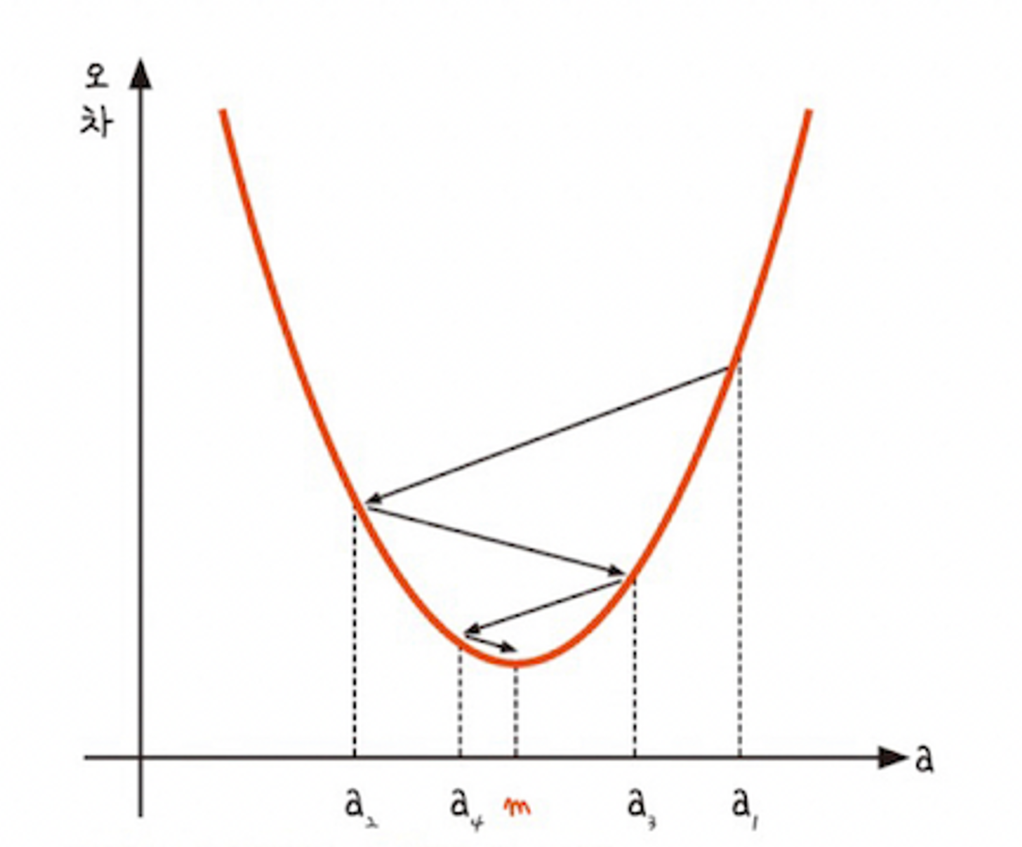 → 기울기 값이 커지면 오차는 어어엄청 커지고 기울기 값이 작아지면 오차는 다시 어어어어엄청 커진다.
